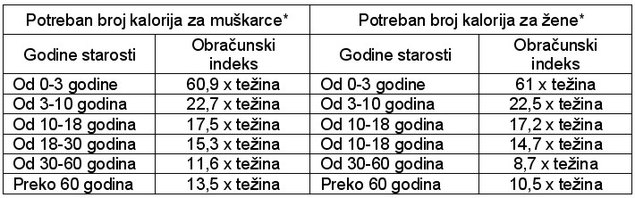 TABELA DNEVNIH POTREBA KALORIJA PO POLOVIMA