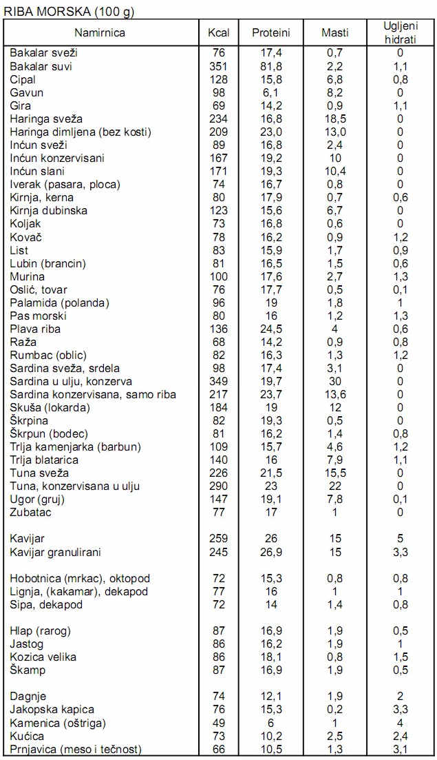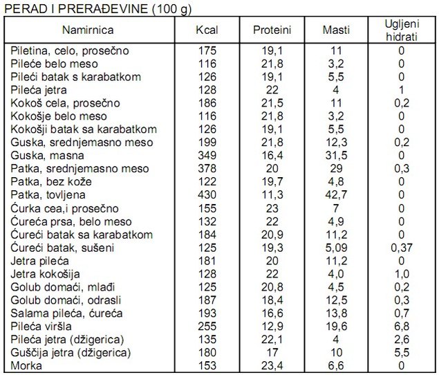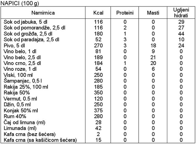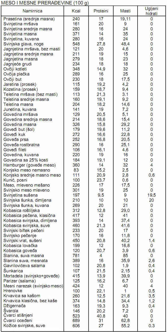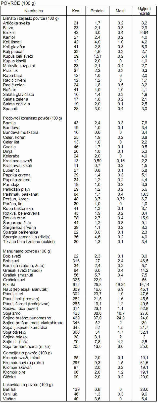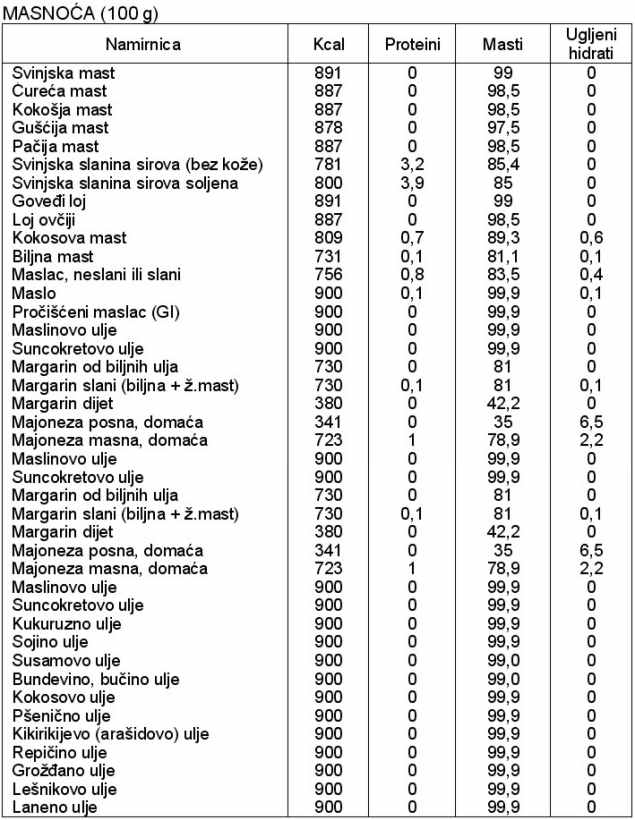 TABELA KALORIJSKIH I HRANLJIVIH VREDNOST OSNOVNIH NAMIRNICA